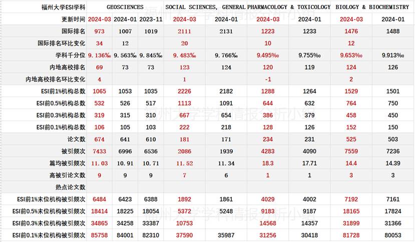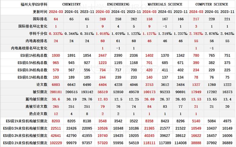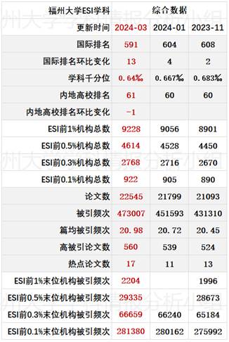 *注:1、Web of Science论文数和被引频次数据来源于InCites,ESI阈值数据来源于ESI。数据来源于InCites,更新时间2024年01月25日,统计时间跨度为2013年1月1日至 2023年12月31日;ESIESI,更新时间为2024年3月15日,统计时间段为2013年1月1日至2023年12月31日。潜力值为被引频次占ESI阈值的百分比。2、表中的差值指的是福州大学被引频次与ESI学科阈值的差距。