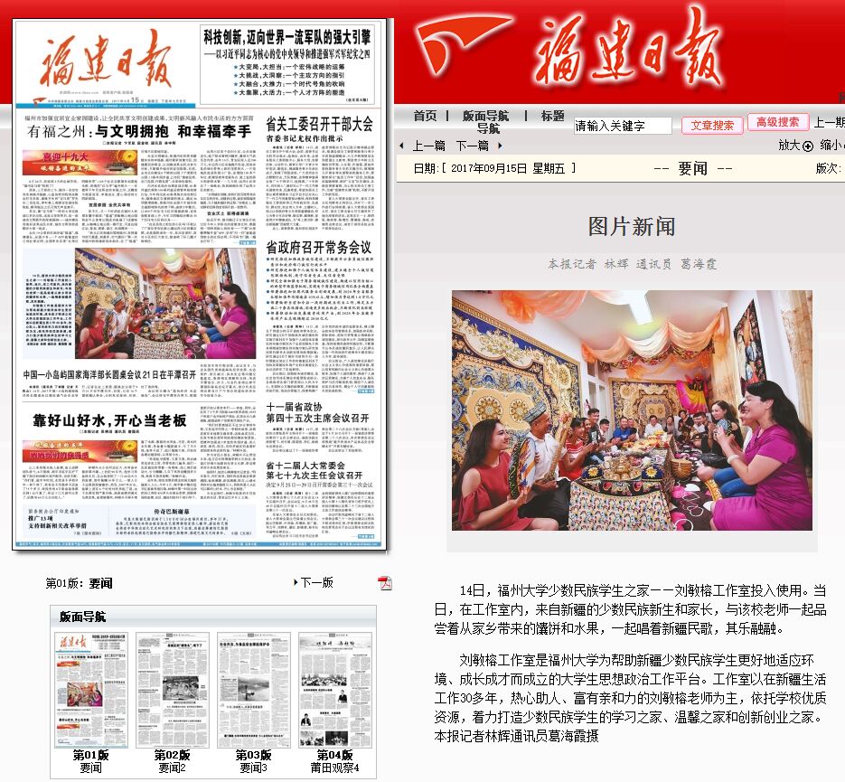 14日,福州大学少数民族学生之家——刘敏榕工作室投入使用。当日,在工作室内,来自新疆的少数民族新生和家长,与该校老师一起品尝着从家乡带来的馕饼和水果,一起唱着新疆民歌,其乐融融。