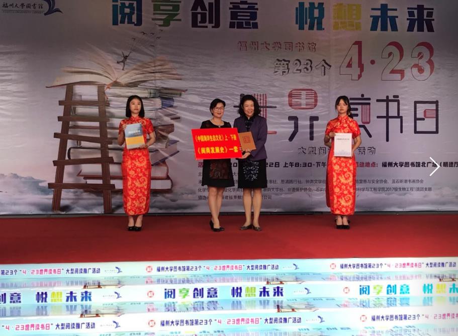 到场领导及嘉宾为朗读者大赛获得一、二、三等奖的选手颁奖。紧接着福州大学闽商研究院苏文菁教授带来了她的两套著作,在这个特别的日子捐赠给福州大学图书馆。