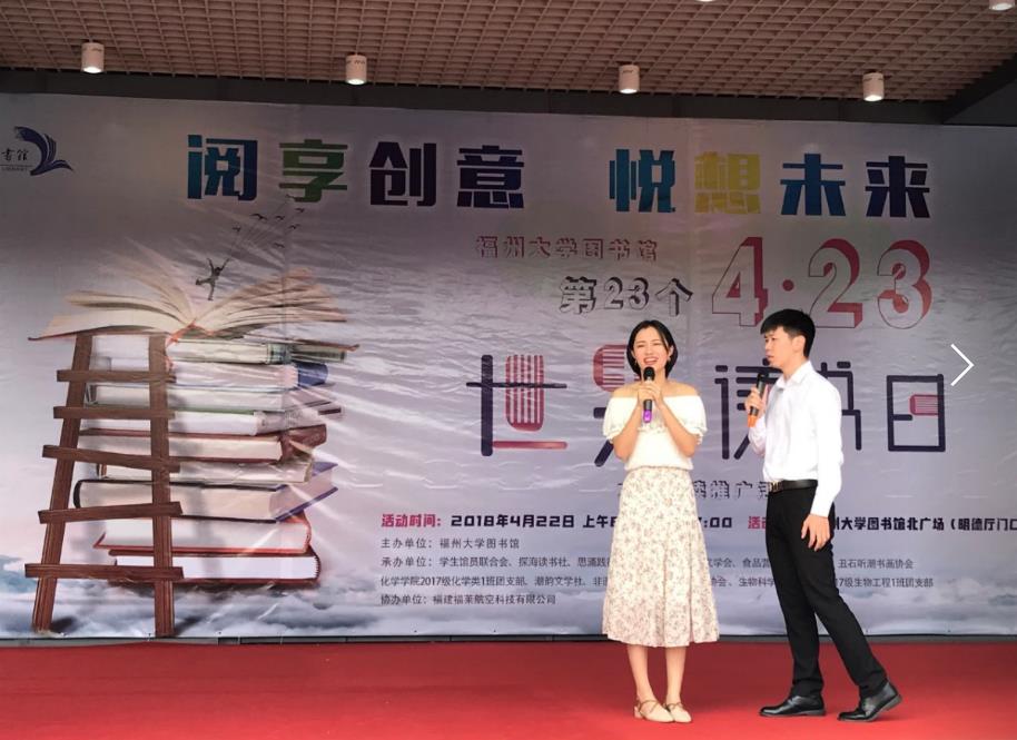 2018年4月22日上午8:30福州大学图书馆北广场热闹非凡,主题为“阅享创意,悦想未来”的第23个“4·23世界读书日”大型阅读推广活动正式拉开帷幕。此次读书日活动由福州大学图书馆主办,图书馆学生馆员联合会、思涌践行社、探海读书社等12个社团承办,福建省福莱航空科技有限公司协办。莅临本次活动的有福州大学直属单位党委书记兼图书馆馆长刘敏榕研究馆员、共青团委员会刘玮副书记、党委宣传部黄乔彬副部长、学生工作部(处)徐宏志副处长、闽商研究院苏文菁院长、直属单位党委林熙阳副书记、图书馆副馆长詹庆东研究馆员、图书馆副馆长史丹双老师及直属单位工会主席林文清老师、图书馆工会主席林雪英老师、等近百名师生参加了今天的活动。
