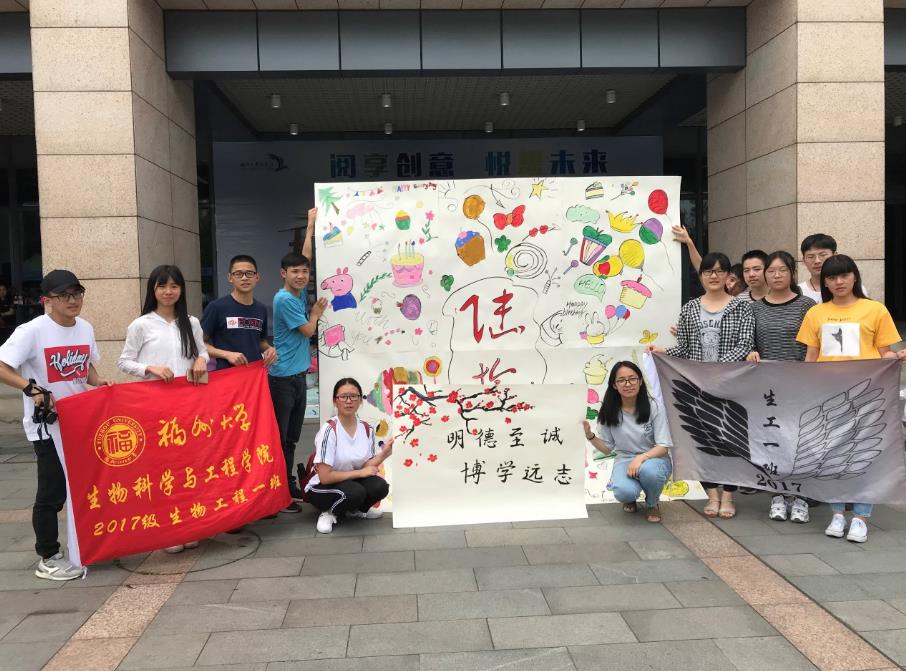 3、“手绘祝福”活动:在活动场地中央进行着17级生工1班团支部的“手绘祝福”活动。今年是福大建校六十周年,团员青年以此作为主题展开手绘活动,同学们纷纷来为手绘作品添色,表达自己对福州大学六十岁的祝福与期盼。