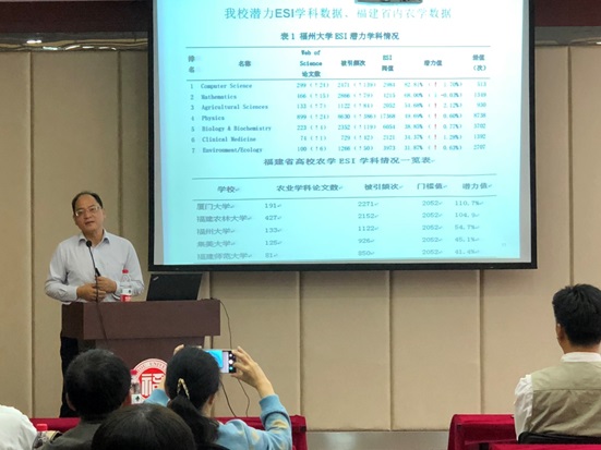 交流会上,詹庆东研究馆员作了关于“ESI·农学学科·生物科学与工程学院”的专题讲座。他从ESI数据来源、相关指标意义和研究前沿介绍了ESI的重要性,通过数据分析介绍了福州大学农业科学学科的发展现状以及生物科学与工程学院对农业科学学科的贡献情况,最后提出了福州大学农业科学ESI潜力学科的若干提升对策。