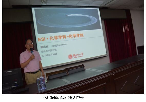 活动当天,图书馆副馆长詹庆东研究馆员为化学学院师生带来了题为《ESI·化学学科·化学学院》的报告。詹副馆长从ESI数据来源、相关指标意义和研究前沿介绍了ESI的重要性,通过数据分析介绍了福州大学化学学科的发展现状以及化学学院对化学、材料、农学等学科的贡献情况,最后提出了福州大学化学科学冲刺千分之一学科的若干提升对策。