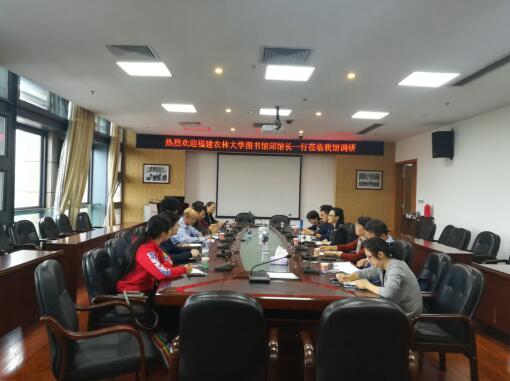 2018年11月12日,福建农林大学图书馆学科服务团队在邱荣祖馆长的带领下,到福州大学图书馆进行调研。福州大学图书馆刘敏榕馆长带领相关部门负责人进行了热情接待。