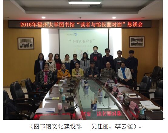 12月8日下午14:30,作为第十三届福州大学图书馆优质服务月系列活动之一的“读者与馆长面对面”恳谈会在图书馆二楼会议室召开。参加恳谈会的有图书馆馆长刘敏榕、直属单位党委副书记林熙阳、图书馆副馆长史丹双、图书馆副馆长詹庆东;相关部门主任,同时还邀请了图书馆借阅量优胜读者代表和勤工助学学生代表们参加这次恳谈会。