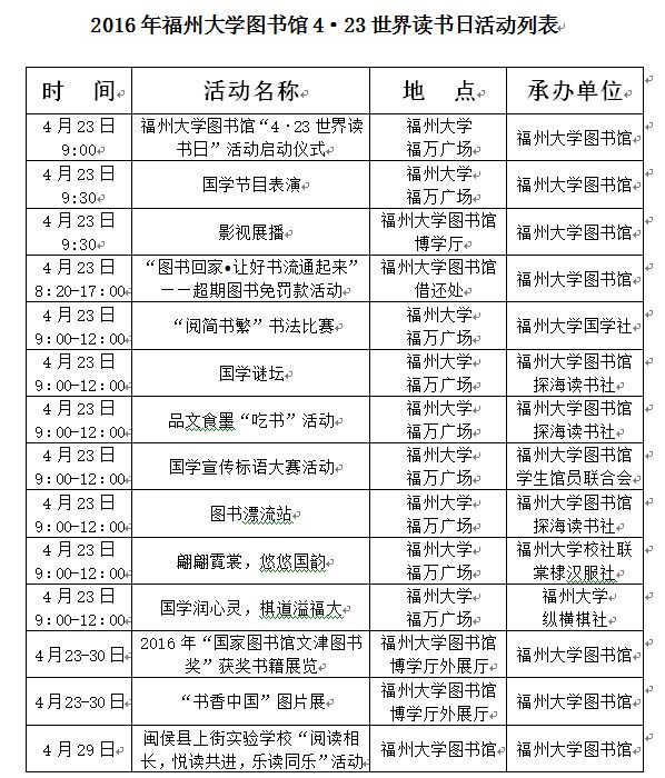 第21个“世界读书日”即将来临,为充分发挥图书馆丰富馆藏资源与文化推广职能,展示与传播中华优秀文化,福州大学图书馆定于4·23世界读书日期间,举办“悦读·品味经典 浸润人生”系列活动,力求通过举办活动推进“全民阅读”,为高水平大学文化建设添砖加瓦。届时,福州大学图书馆将携手探海读书社、思涌践行社、福州大学图书馆学生馆员联合会、国学社、棠棣汉服社、纵横棋社、知音民乐社等单位,联合举办“阅简书繁”书法比赛、国学谜坛、品文食墨“吃书”活动、国学宣传标语大赛、“图书漂流站”活动、“翩翩霓裳,悠悠国韵”、“国学润心灵,棋道溢福大”、2016年“国家图书馆文津图书奖”获奖书籍展览等系列活动,欢迎全校师生积极参与!