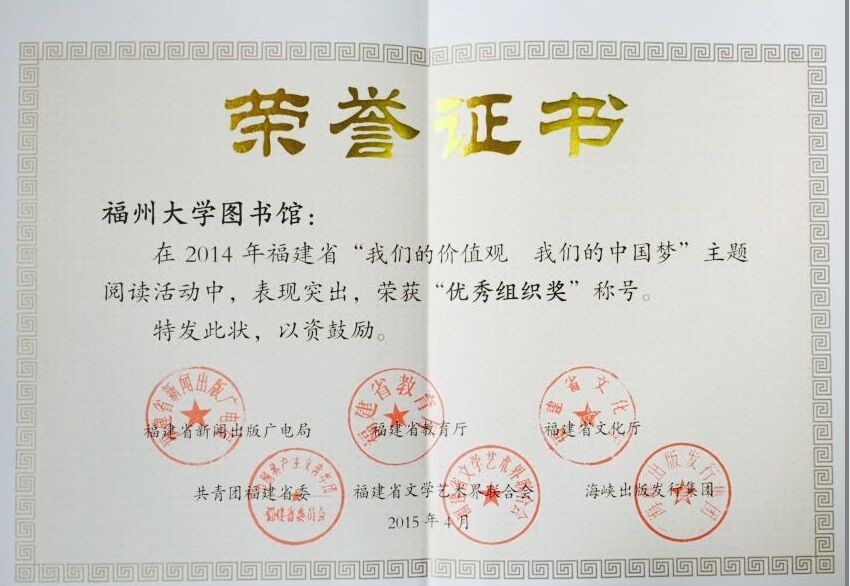 2014年,由福建省新闻出版广电局、福建省教育厅、福建省文化厅、共青团福建省委、福建省文学艺术界联合会、海峡出版发行集团联合举办的“我们的价值观,我们的中国梦”主题阅读活动,我校图书馆指定专人负责该项活动,通过精心组织,周密安排,最终荣获了优秀组织奖。