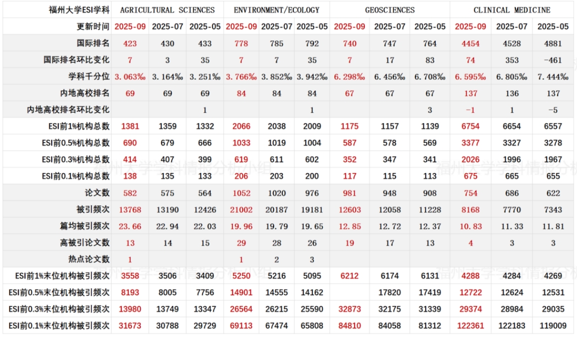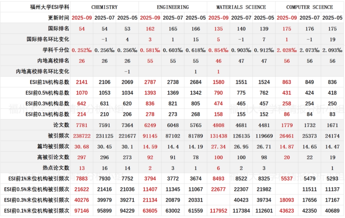 表 3 福州大学 ESI 学科进展情报