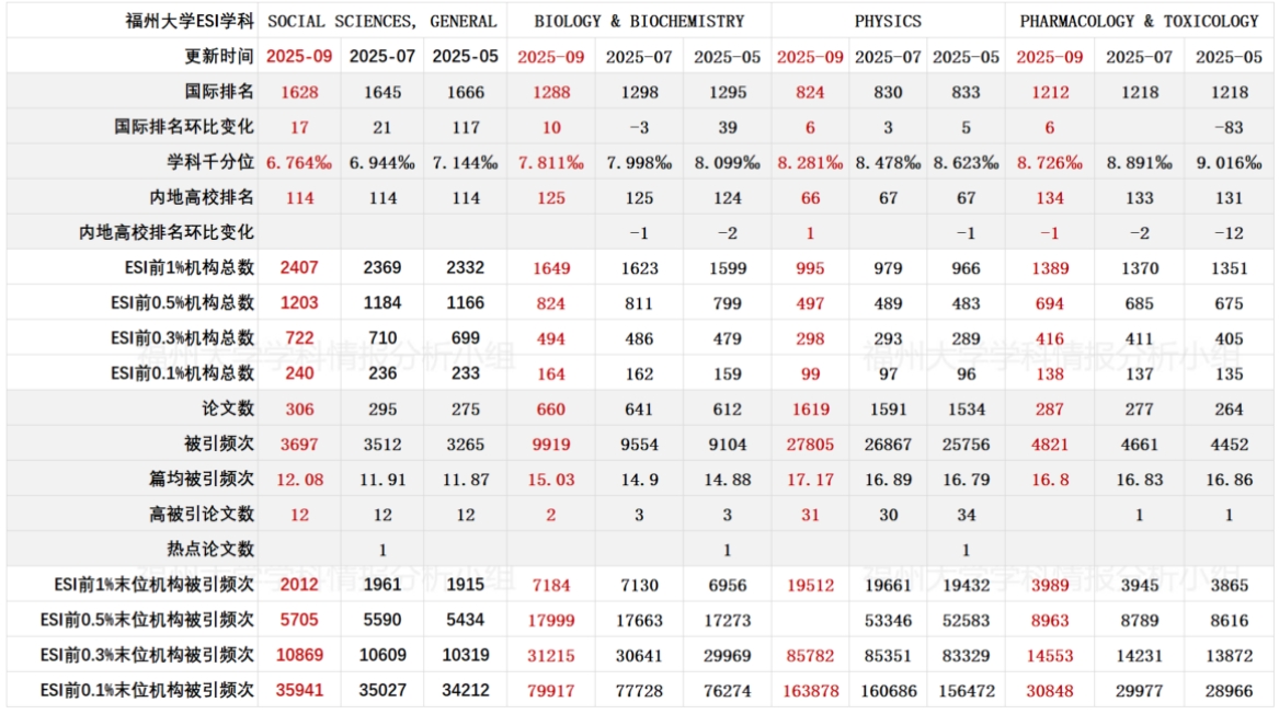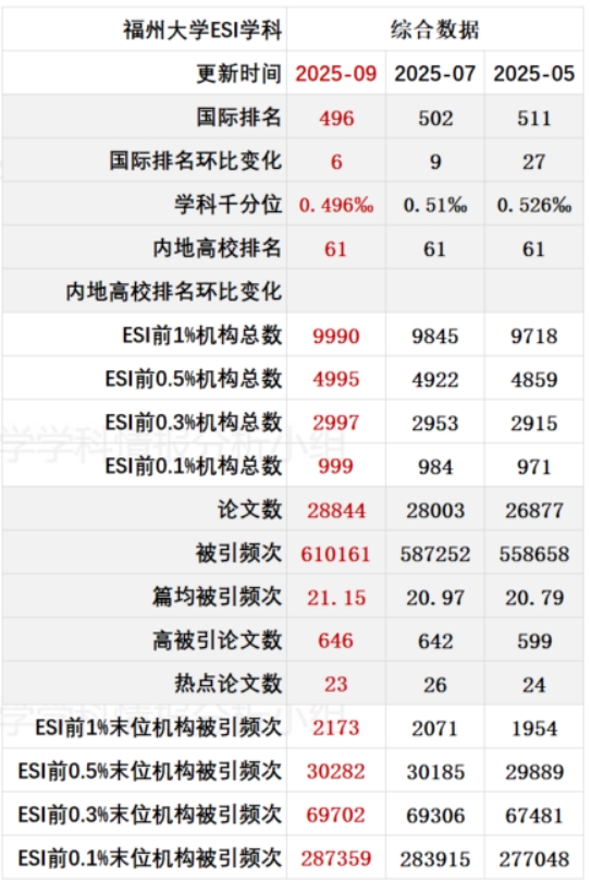 表 2 福州大学 ESI 学科综合数据进展情报
