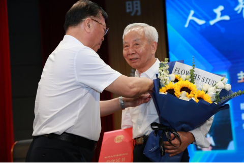陈国龙书记向蔡自兴院士颁发嘉锡讲坛荣誉证书,并为其佩戴福州大学校徽,以致崇高敬意。